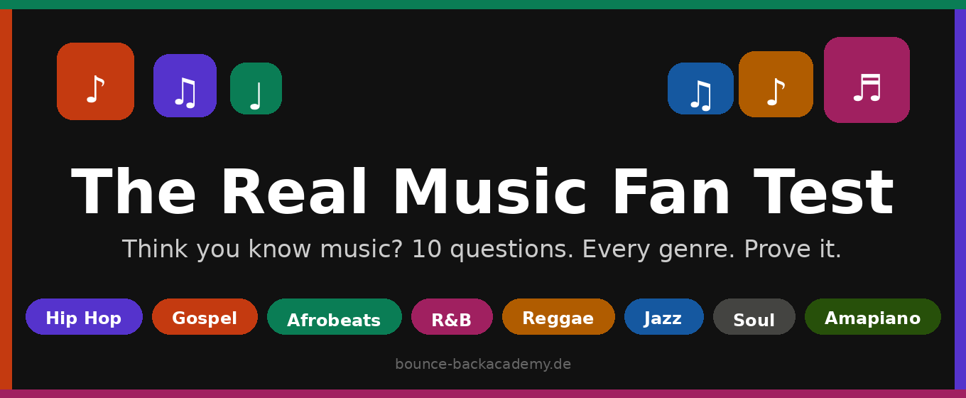 50 questions covering music history, genres, and artist facts — from easy to expert level. Earn badges, build streaks, and get your shareable result card at the end!